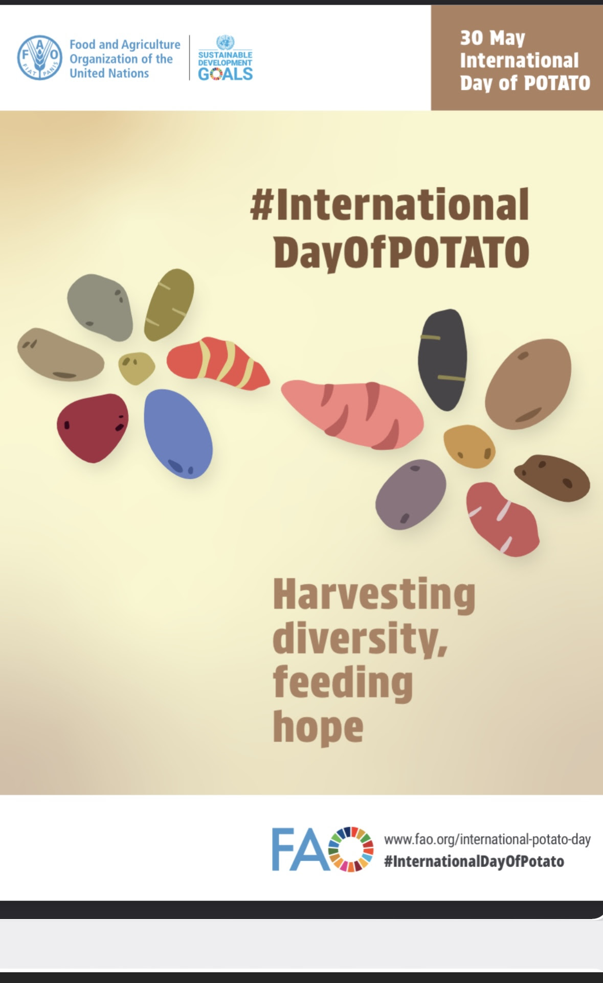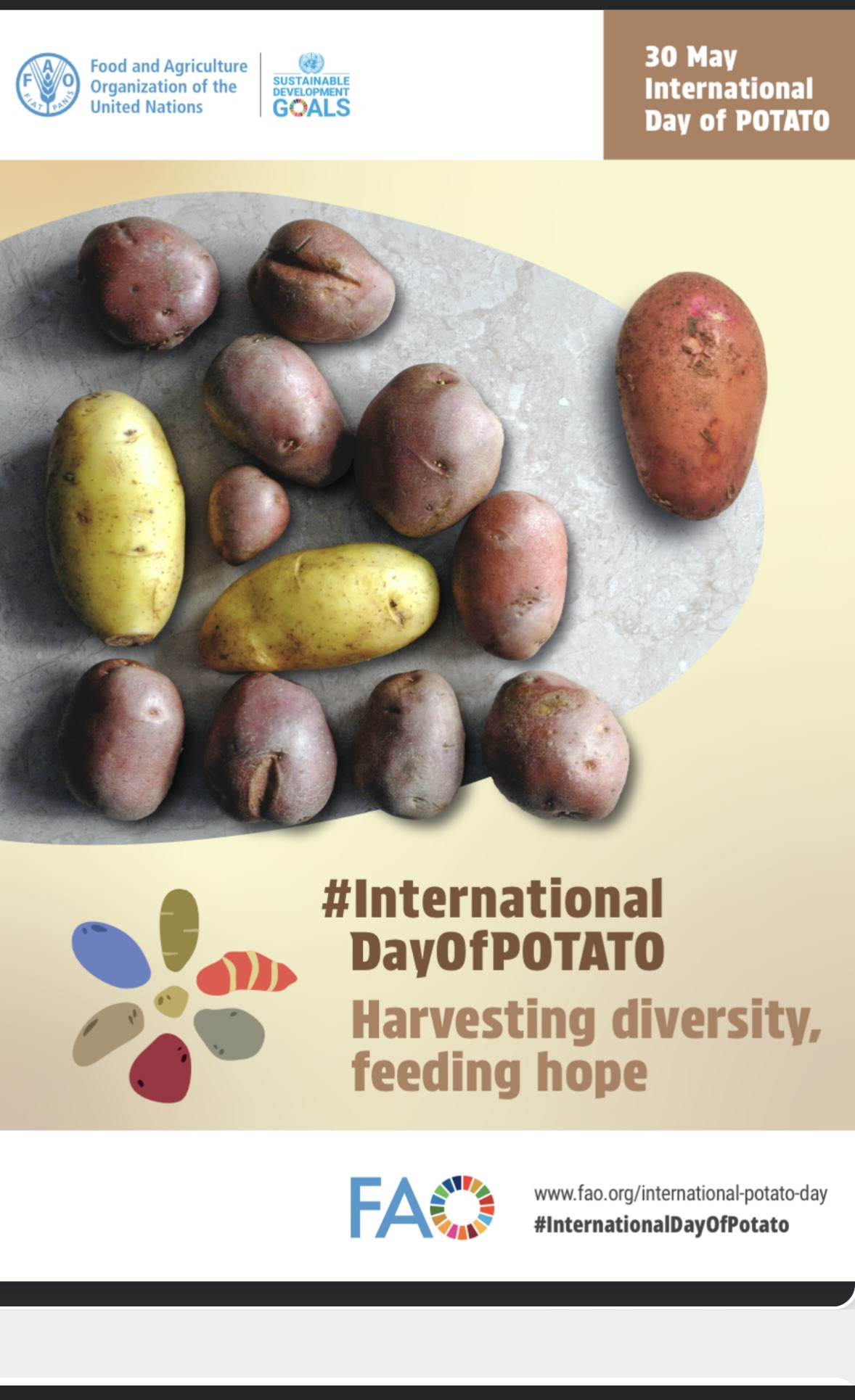 En diciembre de 2023, la Asamblea General de las Naciones Unidas designó el 30 de mayo como el Día Internacional de la Papa (DIP). El Día Internacional se basa en el legado del Año Internacional de la Papa (2008) y reafirma la importancia de la cadena de valor de la papa en la lucha contra el hambre y la desnutrición y el logro de los Objetivos de Desarrollo Sostenible para 2030. El tema de este año para el Día Internacional es “cosechar la diversidad, alimentar la esperanza”, un reconocimiento tanto de la importante diversidad genética del cultivo como de su potencial aún no aprovechado en la búsqueda de lograr la seguridad alimentaria y la nutrición universales. Se abordará la diversidad, distribución y producción de papas en todo el mundo, así como el papel de la papa frente a los desafíos globales actuales.